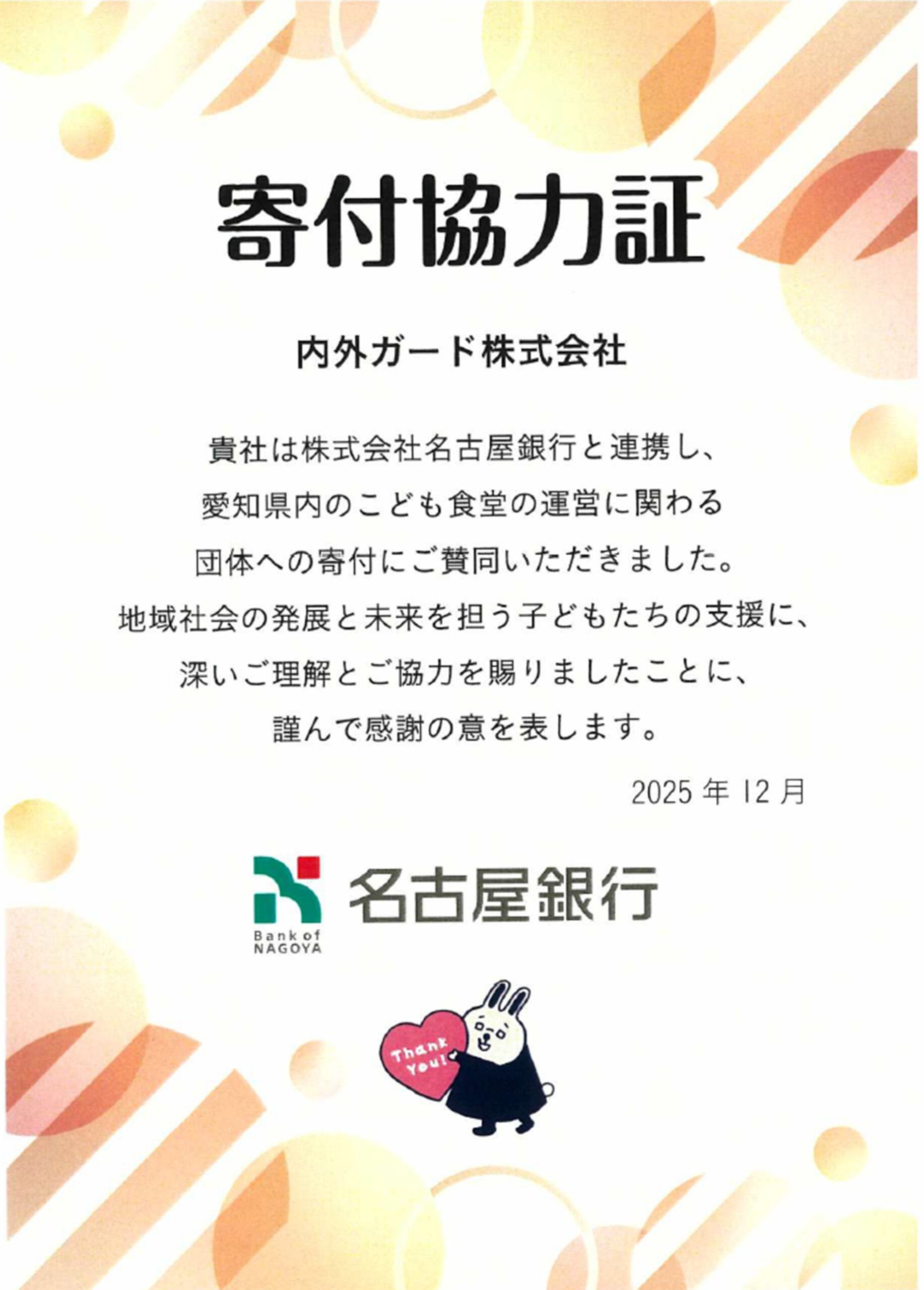 | 寄付協力証 | 名古屋銀行様を通じて愛知県内の子供食堂へ寄付を行っています。 | 有資格者一覧 | 各種消防設備士 電気工事士 消防設備点検資格者 防火対象物点検資格者 防災管理点検資格者 防災士 防災備蓄管理士 高所作業特別教育 テールゲートリフター特別教育 |