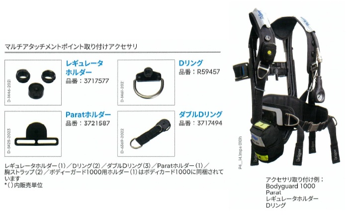 PSSAirBossシリーズの肩ベルト及びウェストベルトには、レギュレータホルダー、Bodyguard1000、Parat等を取り付けるための、マルチアタッチメントポイントがついています。