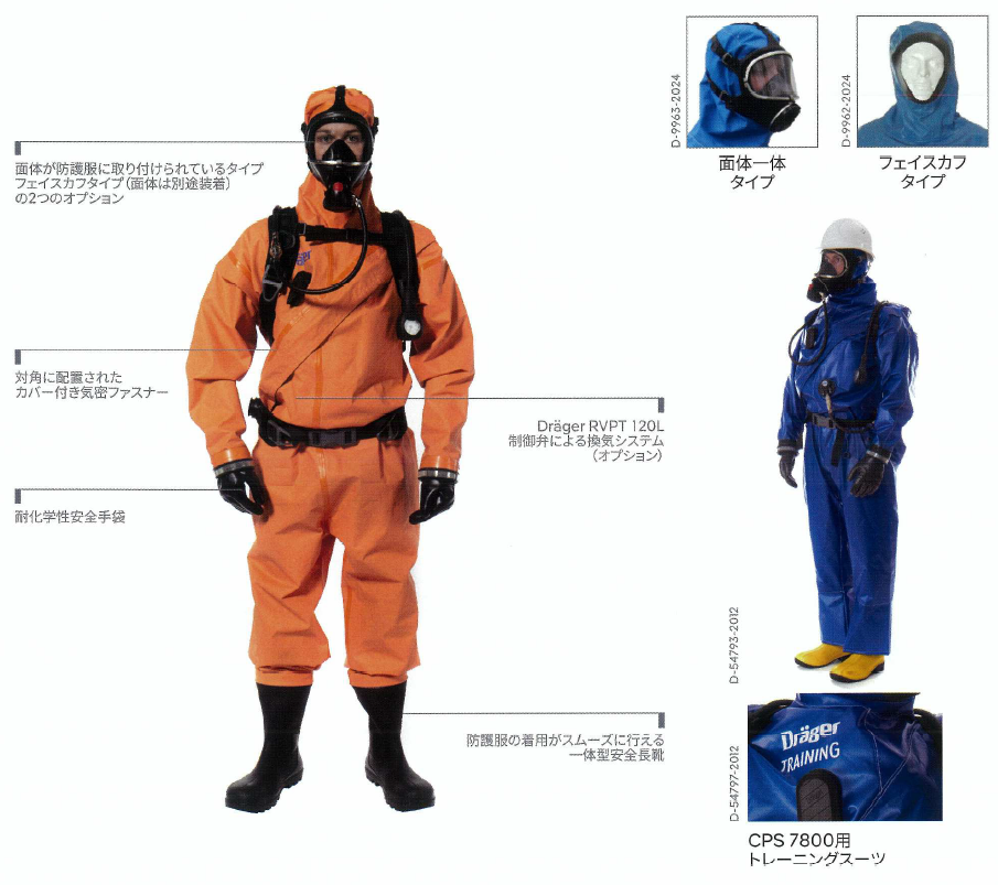 Drager CPS 7800は、爆発危険区域での作業にも使用可能な、ガス、液体、エアロゾル、固体状の有害物質から全身を保護するリューサブル(再使用)タイプの気密形化学防護服です。 革新的な素材と新デザインにより、入槽作業や低温物質取扱いの際でも、優れた柔軟性と快適性を実現します。 面体一体タイプ・フェースカフタイプの2種類のオプションがあります。