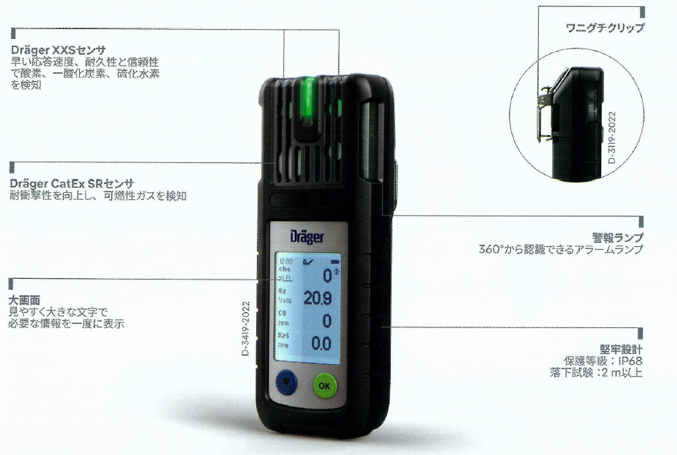 一台で最大4成分(酸素・ー酸化炭素・硫化水素・可燃性ガス)の検知が可能な携帯型ガス検知警報器です。 Bluetooth®搭載でDigger Gas Detection Connectソフトウェアへライブデータの転送*も可能です。 また、オプシヨンの外付けポンプを装着すれば、閉鎖空間進入前の環境測定にも使用できます。