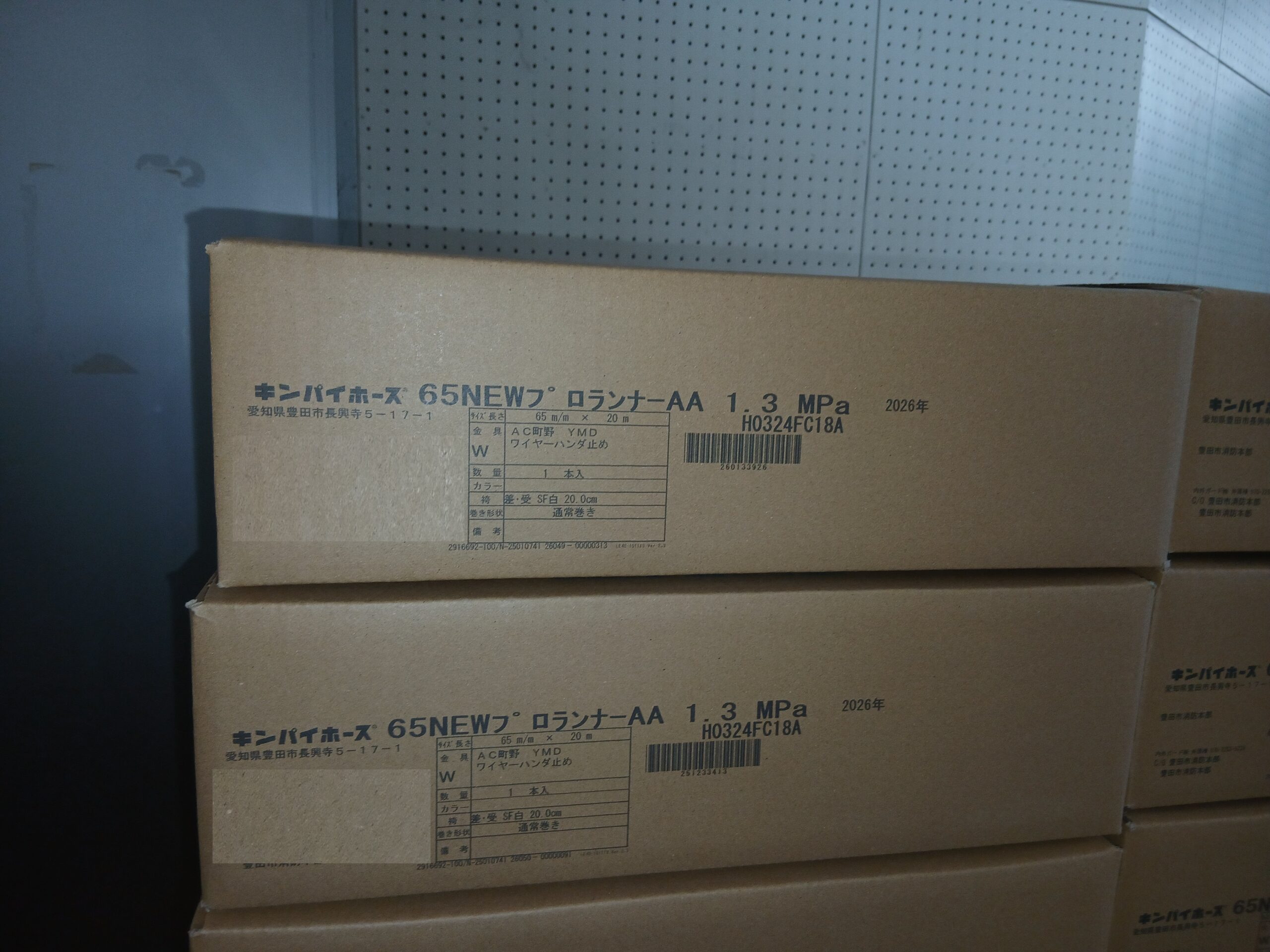 愛知県内自治体様へ消防団様用消防ホースを納品いたしました。 商品:キンパイホース 65NEWプロランナーAA 使用圧1.3MPa 65㎜×20mホース 本数:129本